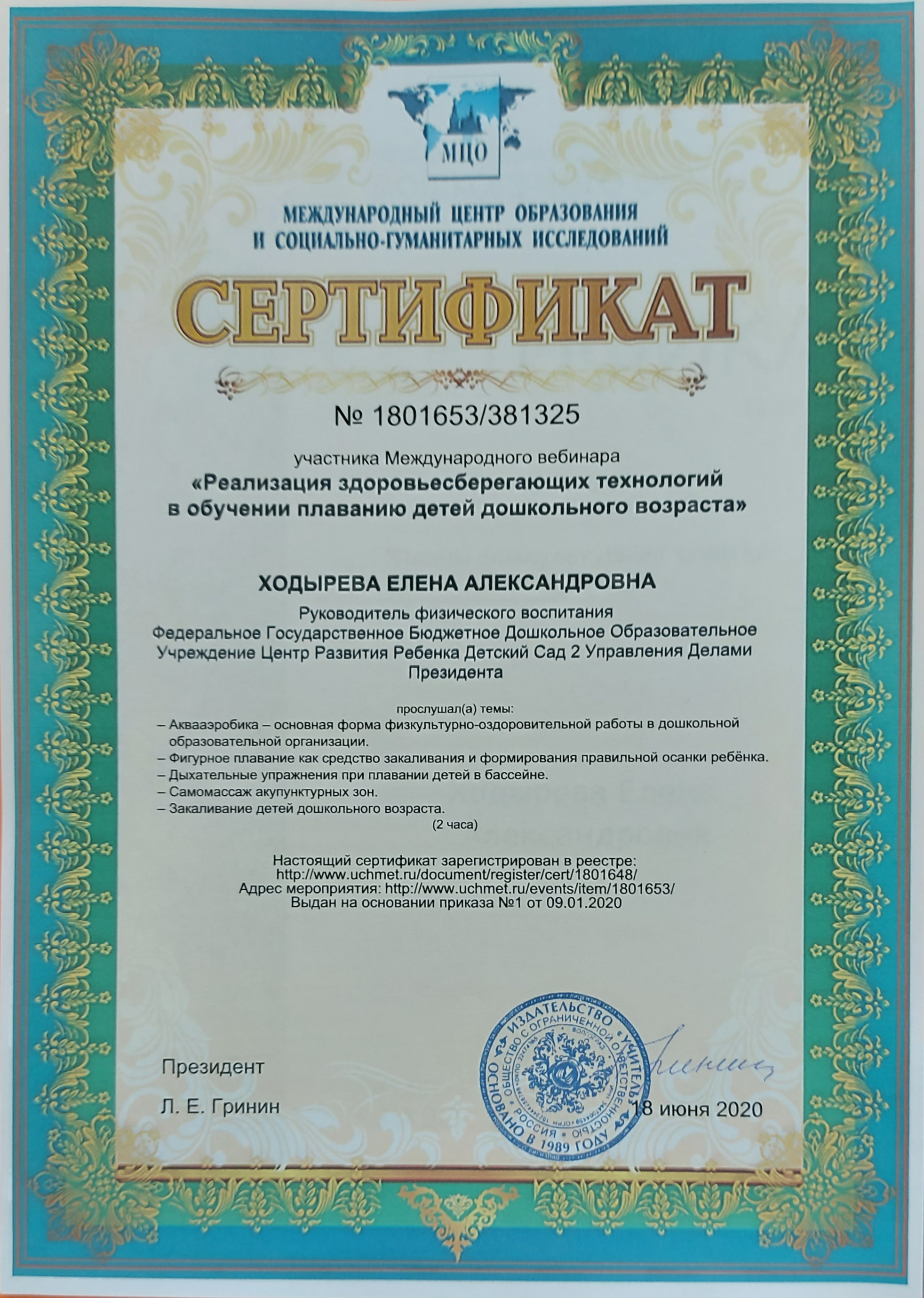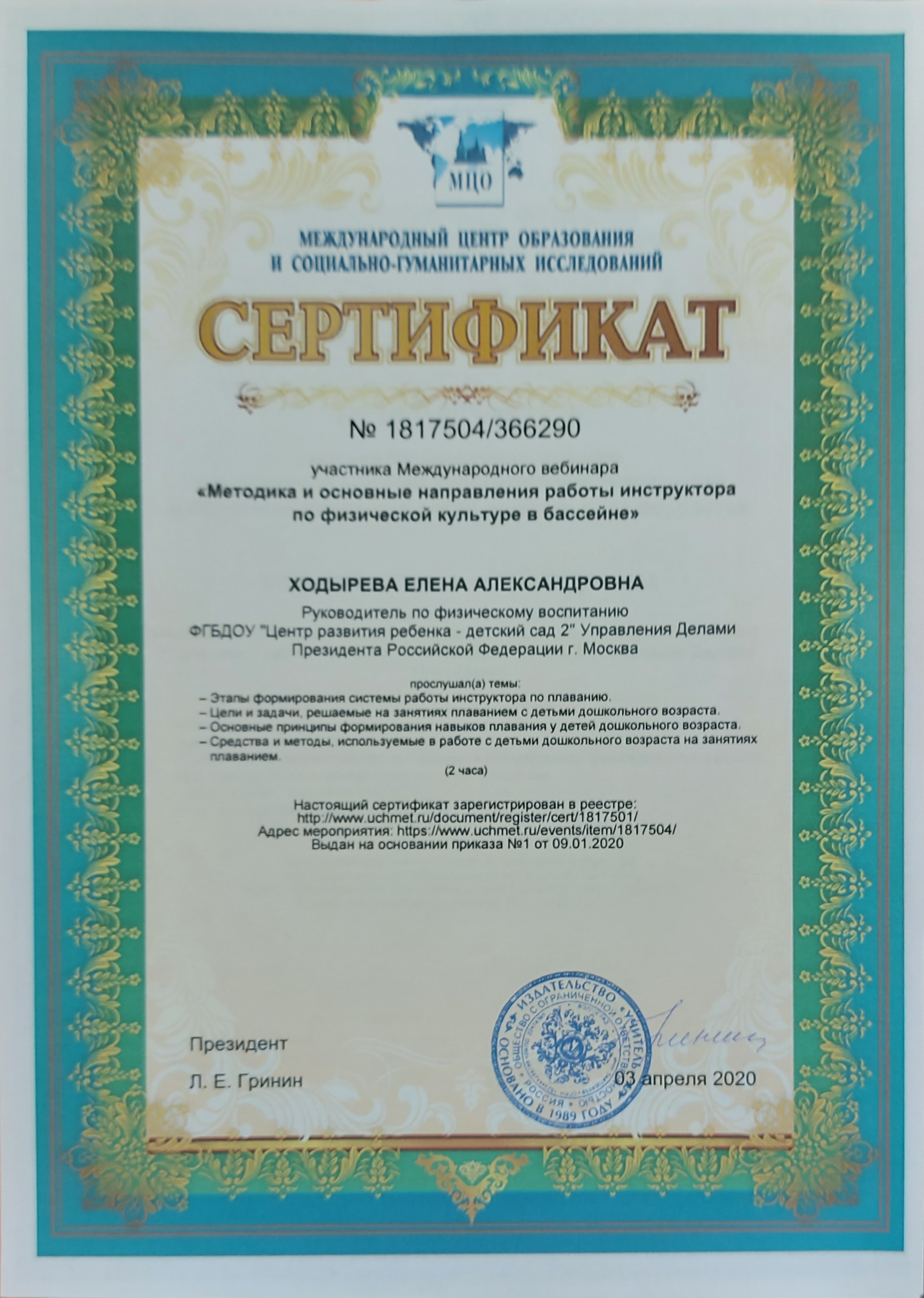 Сертификат "Методика и основные направления работы инструктора по физической культуре в бассейне" 2020г