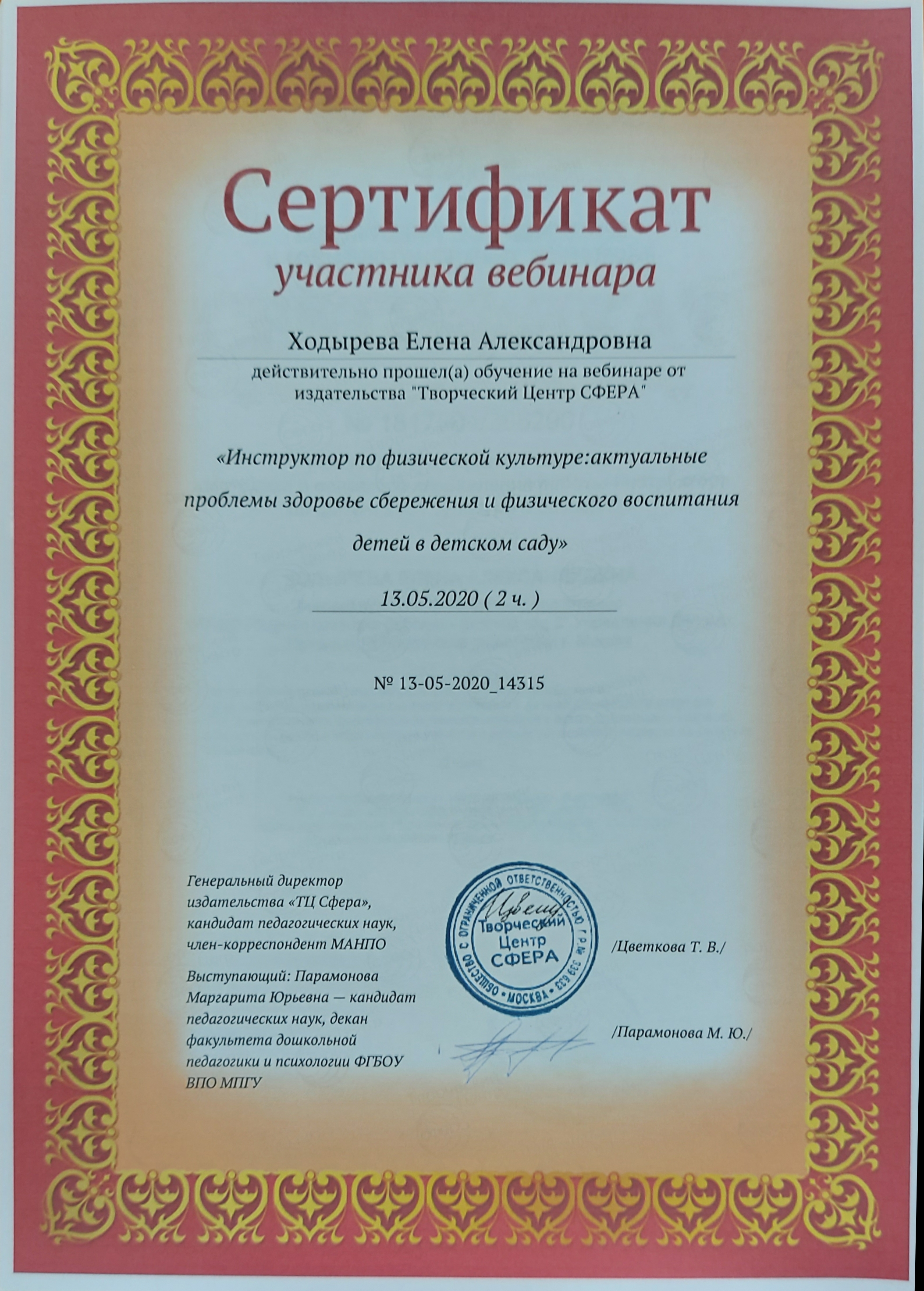 Сертификат " Инструктор по физической культуре: актуальные проблемы здоровье сбережения и физического воспитания детей в детском саду" 2020г