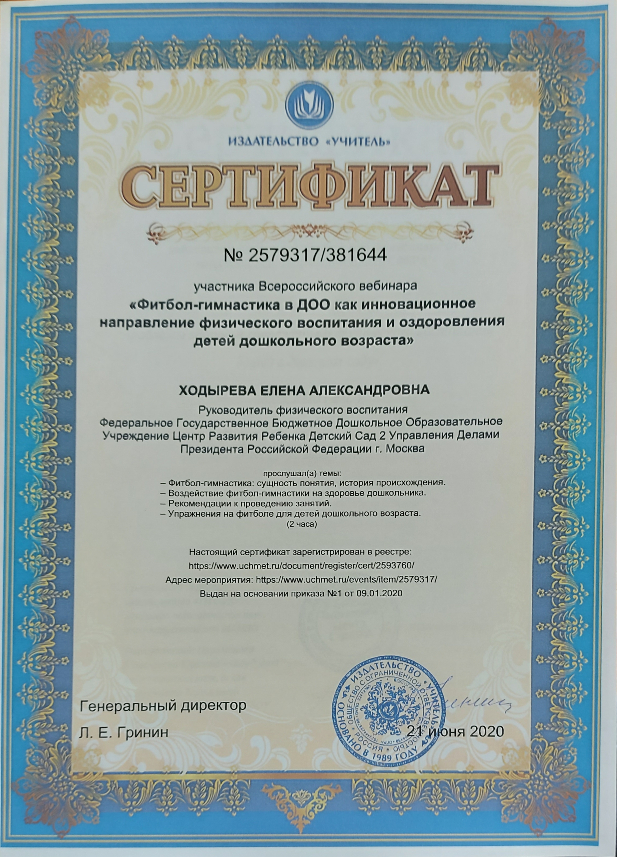 Сертификат "Фитбол-гимнастика в ДОО как инновационное направление физического воспитания и оздоровления детей дошкольного возраста" 2020г