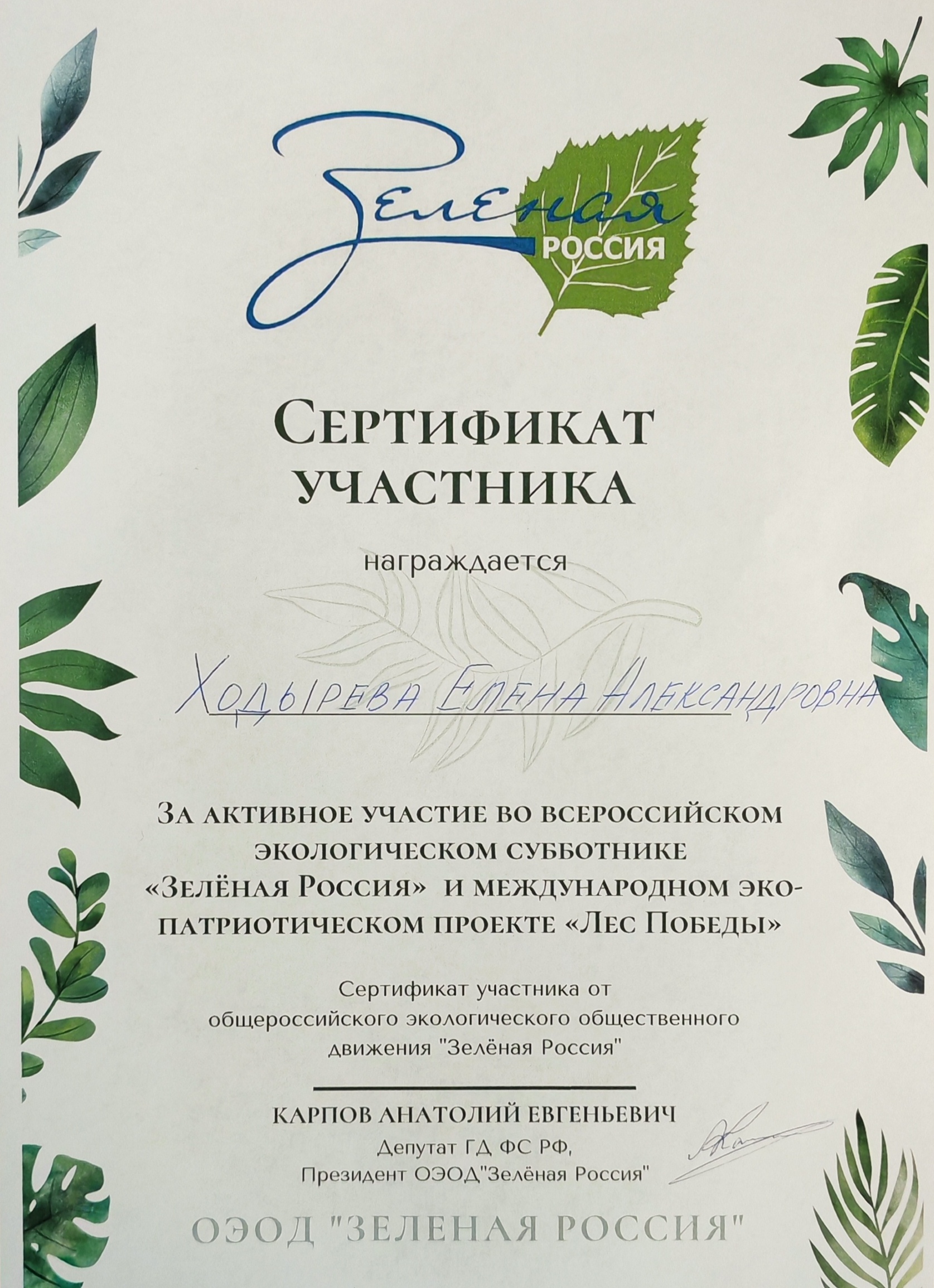 Сертификат за участие во Всероссийскоком экологической субботник "Зелёная Россия" 2025г
