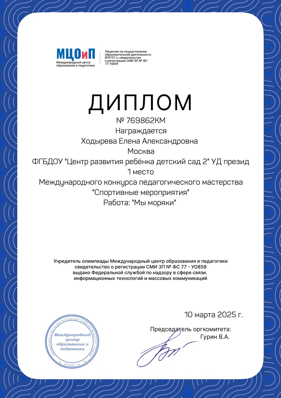 Диплом "Спортивные мероприятия"