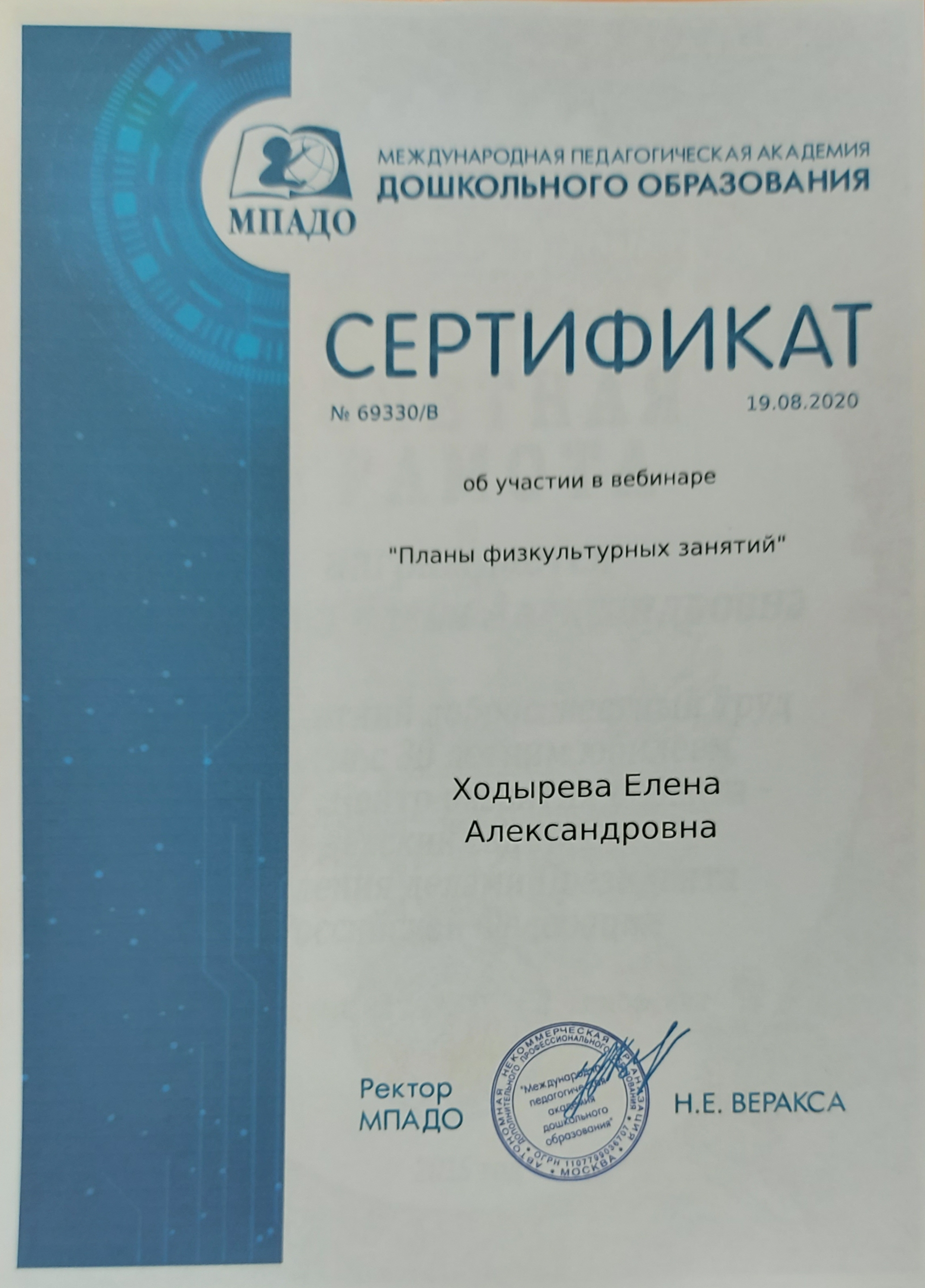 Сертификат "Планы физкультурных занятий" 2020г